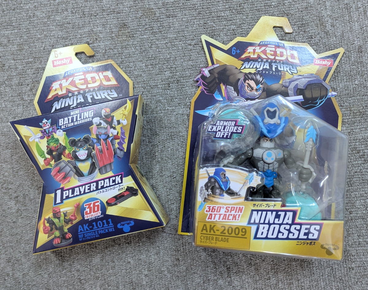 続いて、「伝説のアケド LEGENDS OF ニンジャフューリー」のアクショントイ「サイバーブレイド」と「ミニバトリングアクションウォーリアー」だ。いずれも豪州の玩具メーカーの製品で、2024年に日本に初上陸したのだとか。