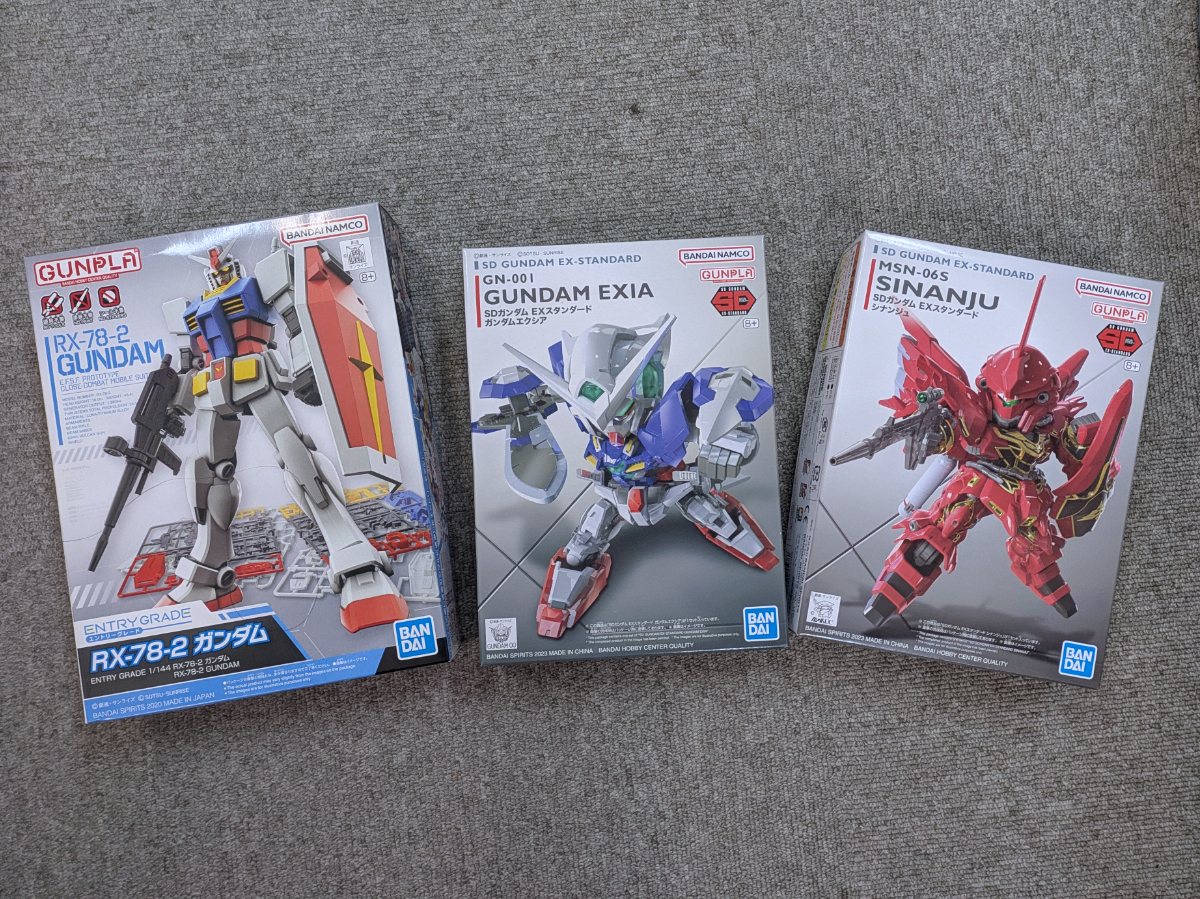 続いてガンプラ3商品。「RX-78-2 ガンダム(1/144スケール)」と、SDガンダムEXスタンダードの「ガンダムエクシア」と「シナンジュ」である。