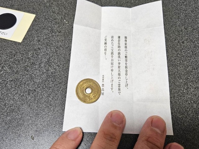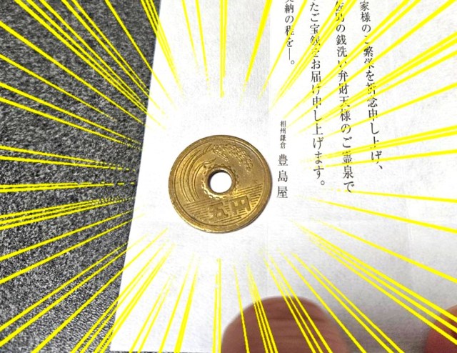 実はこちらの5円玉 正確には現金ではなく、鎌倉の銭洗い弁天で清めた「ご宝銭」とのこと。超有難い代物なのでお守りとして大切に持ち運ぶとしよう。