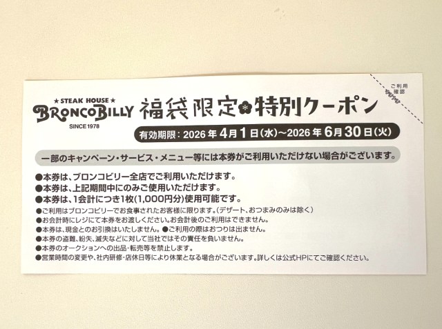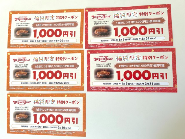 そして、ブロンコビリーの福袋を “勝ち確” たらしめている「福袋限定 特別クーポン」は、1000円引き×5枚で合計5000円分。
