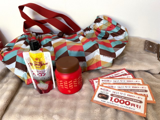 店内には福袋の案内ポスターが掲示されていた。今年の福袋は、クーポン5000円分のほか、お買い物保冷バッグ、大判ブランケット、スープジャー、そしてベーコンドレッシングがセットになっている。