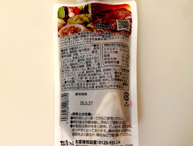 容量は150mLでベーコンたっぷり、にんにくやスパイスの豊かな風味が特徴とのこと。賞味期限は2026年5月27日だった。