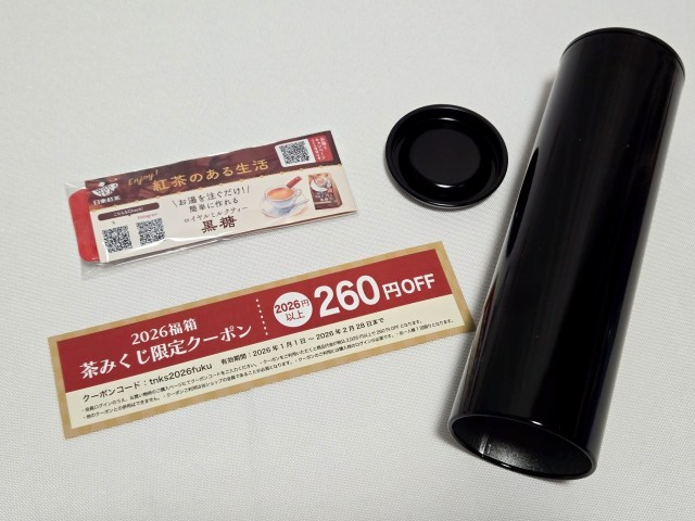 ▼特典も付くので、日東紅茶の福箱は先行予約がオススメです。今年は2026年秋冬新商品である「ロイヤルミルクティー黒糖」が1本と、紅茶缶に使える筒、限定クーポンがついてきたよ。