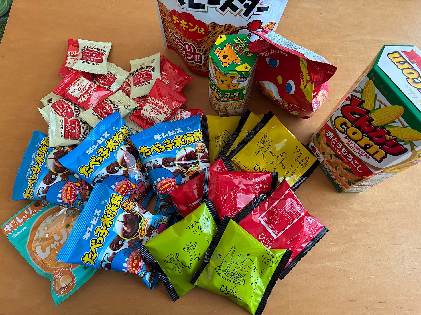 ▼大袋菓子をパッケージから出してみたところ、絵面が完全に何かしらの打ち上げパーティになった。打ちあがっていこー!!!