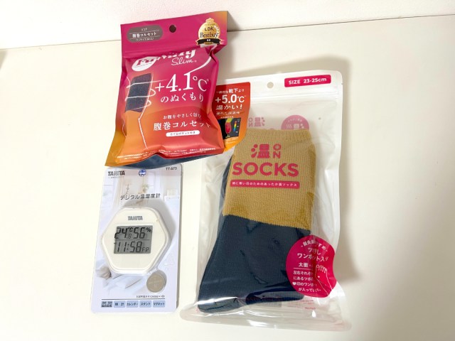 「TANITAデジタル温湿度計(TT-573)」は、価格比較サイトの最安値で1200円台。「CB JAPANあったか温ソックス」はメーカー希望小売価格で税込1100円。「YB-LAB ふわりぃスリム腹巻コルセット」はメーカー希望小売価格が1780円だった。