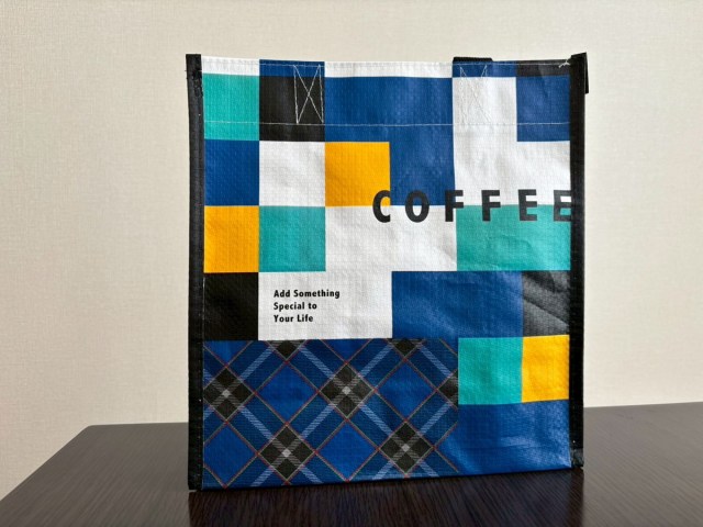 上島珈琲店、つまり、UCC創業の地である神戸を象徴する「神戸タータン」を使用したオリジナルデザインだそう。老若男女問わず日常使いできるデザインで、結構頑丈な作り。