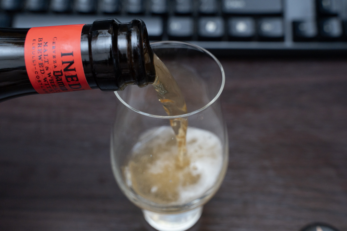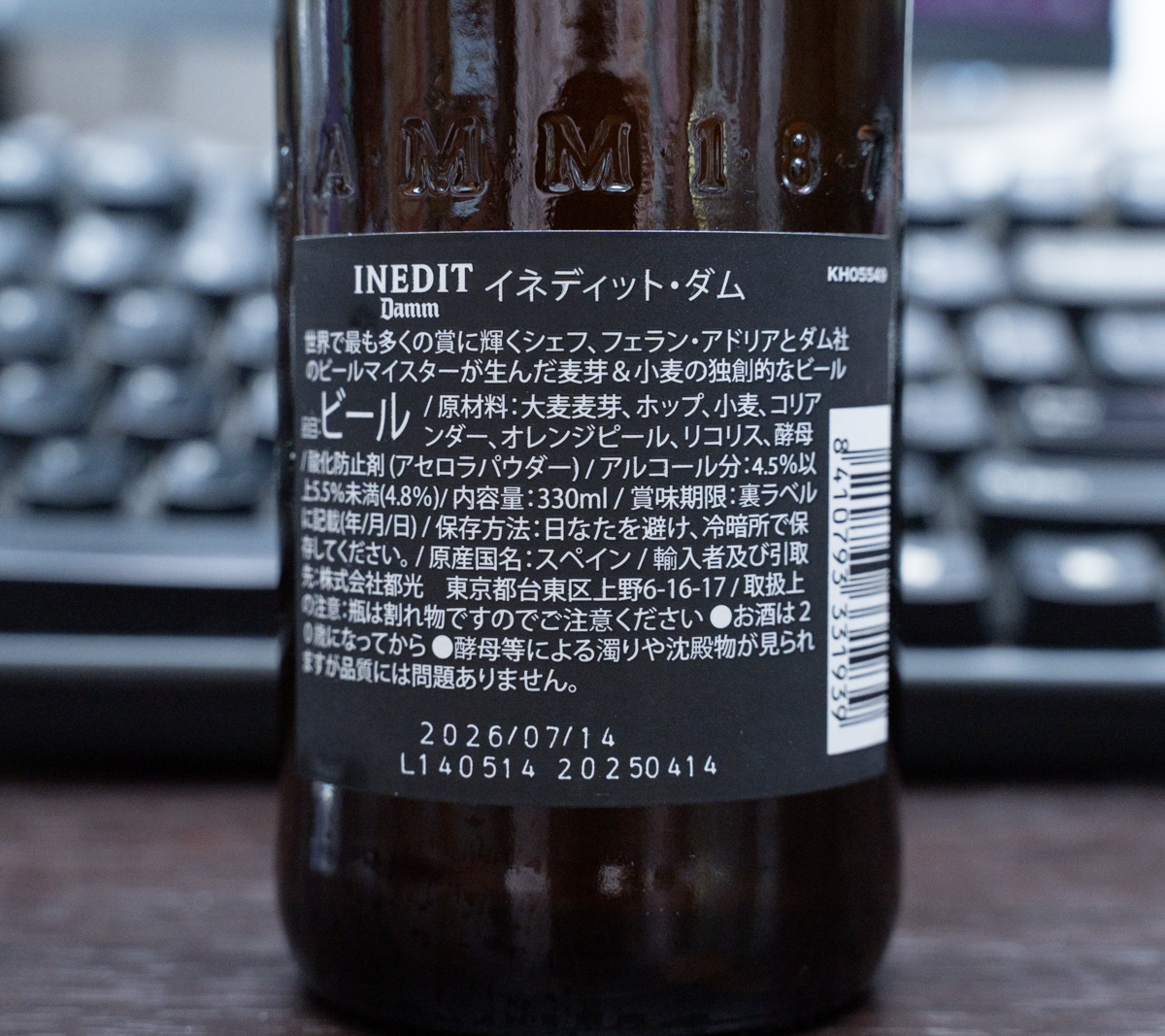 ラベルによると「イネディット・ダム」というらしい。度数は4.5%以上5.5%未満。スペイン産だ。主成分は大麦麦芽にホップ。このあたりはまごうこと無きビール。
