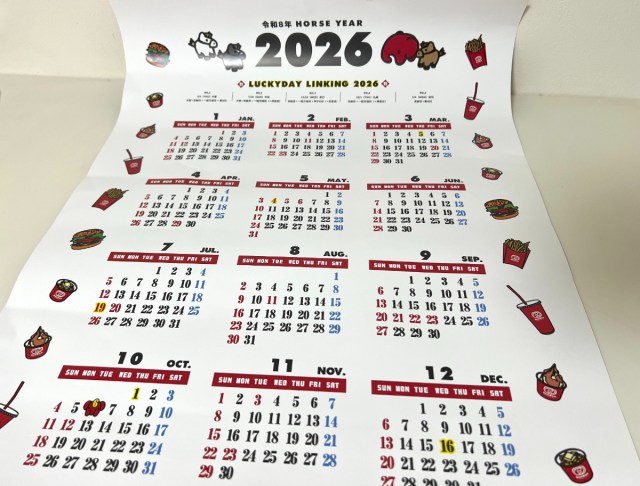 続いて「2026年カレンダー」。A2サイズ(タテ594mm、ヨコ420mm)の大判カレンダーで、2026年のラッキーDAYが記載されている。