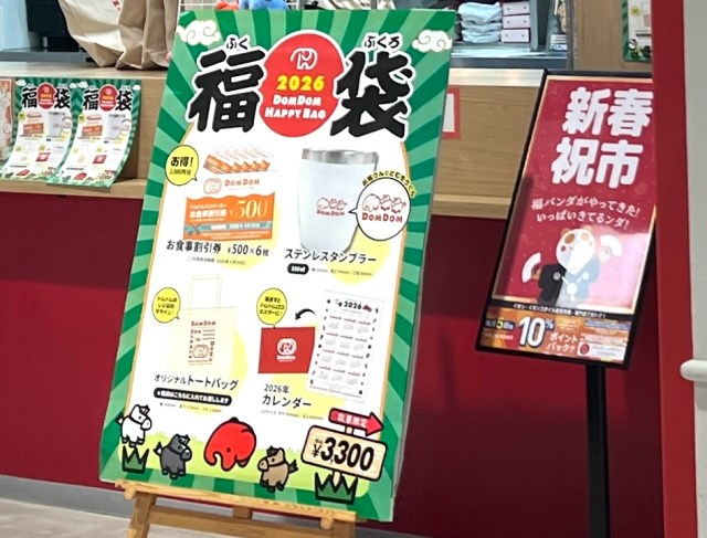 そして2026年も1月1日から一部店舗を除く全国のドムドムバーガーで福袋の販売が開始された。今年の価格は税込3300円。昨年が3000円だったことを考えると、300円の値上げとなった。なお今年も昨年に引き続き、オンラインショップでの販売はなく、店頭販売のみだ。