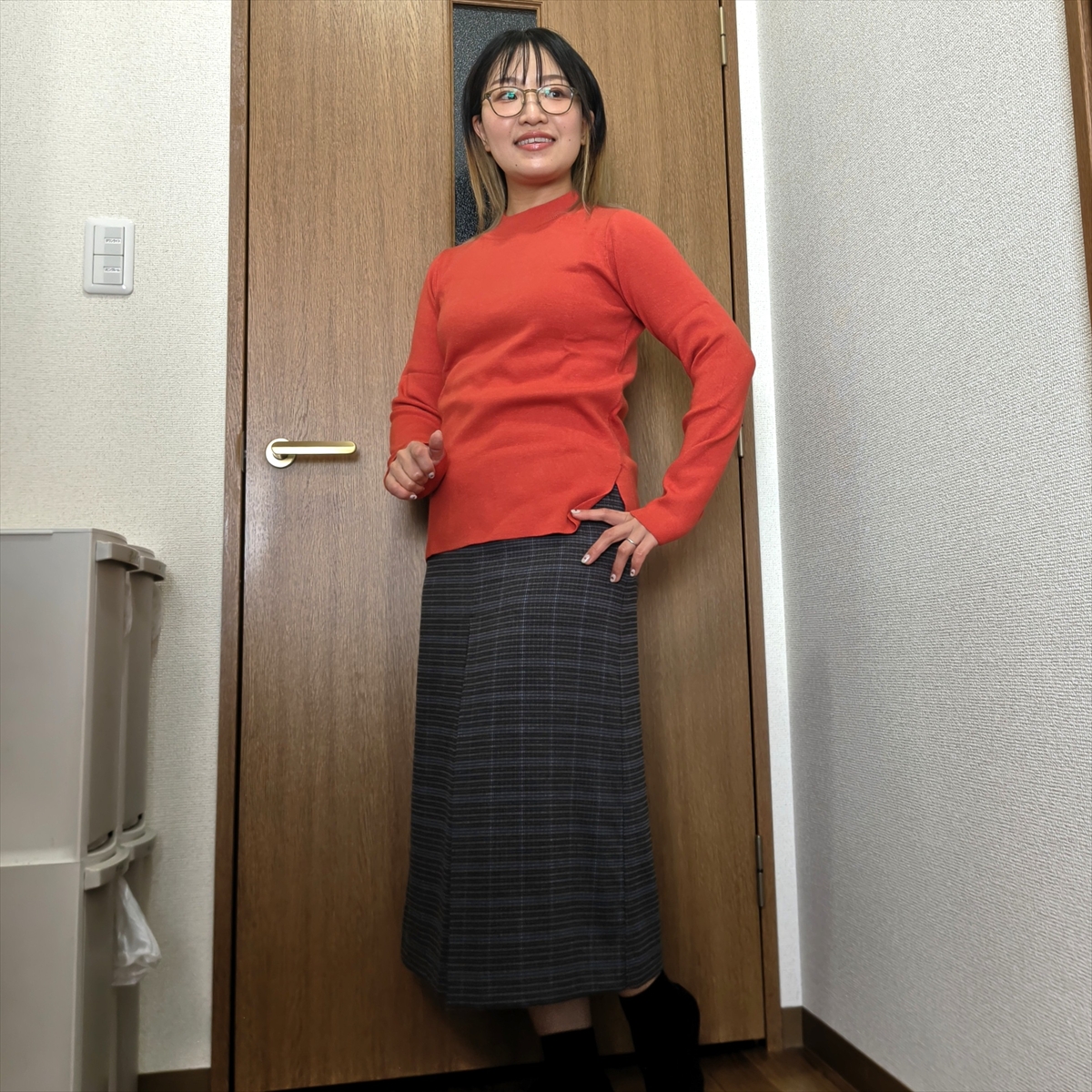 まずはラメ入りニット×チェック柄スカート。うんうん、悪くない!