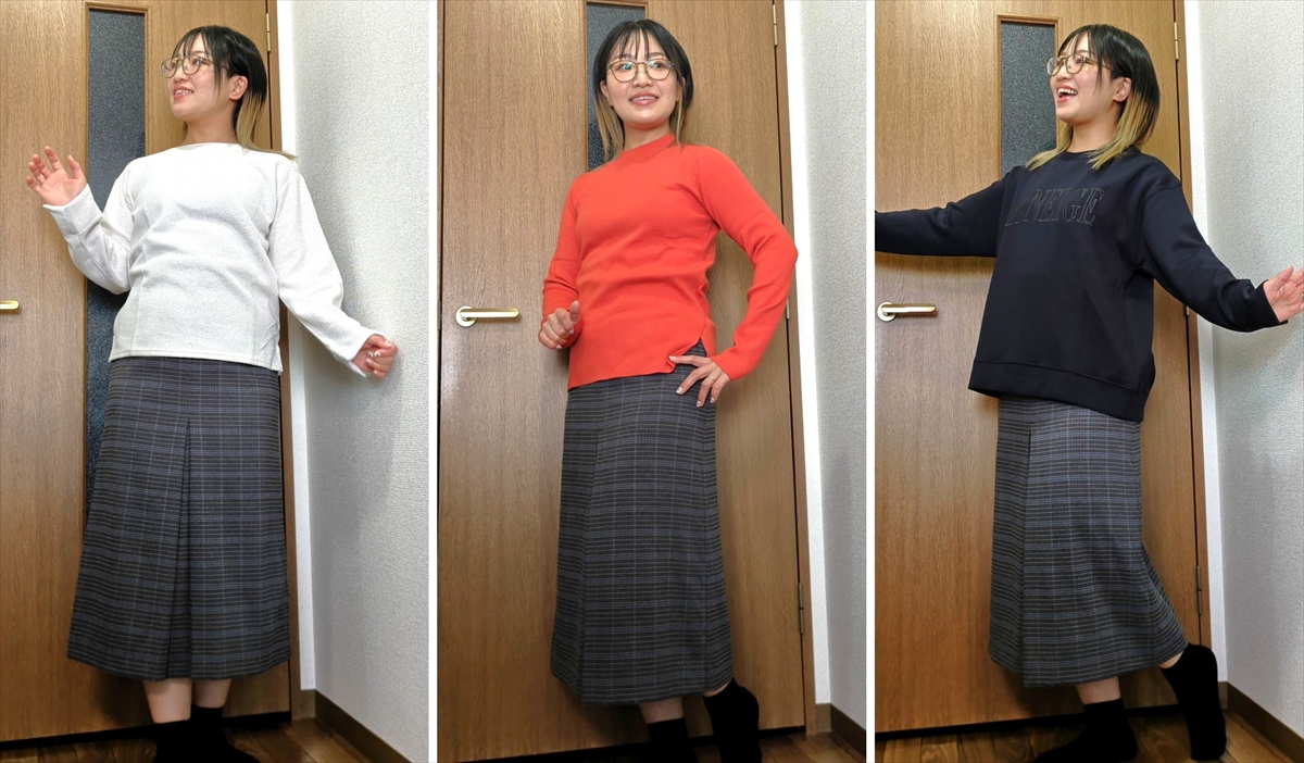 あらやだ、これまたイイ感じ! シルエットや生地のしっとり感が絶妙なのだろうか。カジュアル過ぎずカチッとし過ぎずちょうどいい塩梅。スウェットなのに、デートに着ても許されそうなほど上品である。