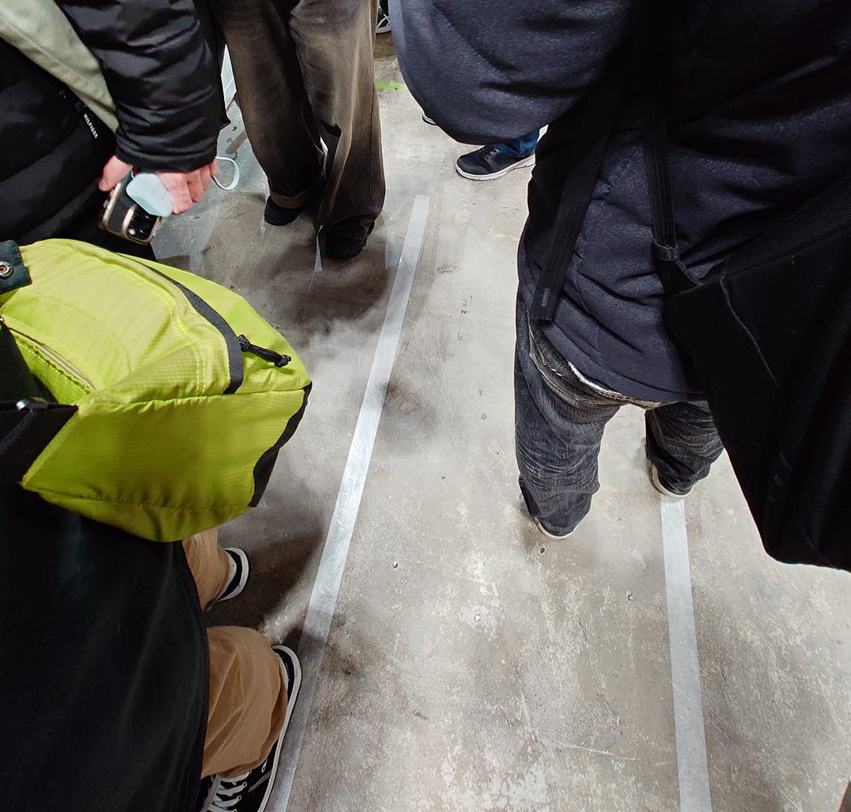 床にはテープで列形成のガイドが設けてあります。やってきた参加者の多くは、特に何も言われずともガイドに沿って並ぶわけです。