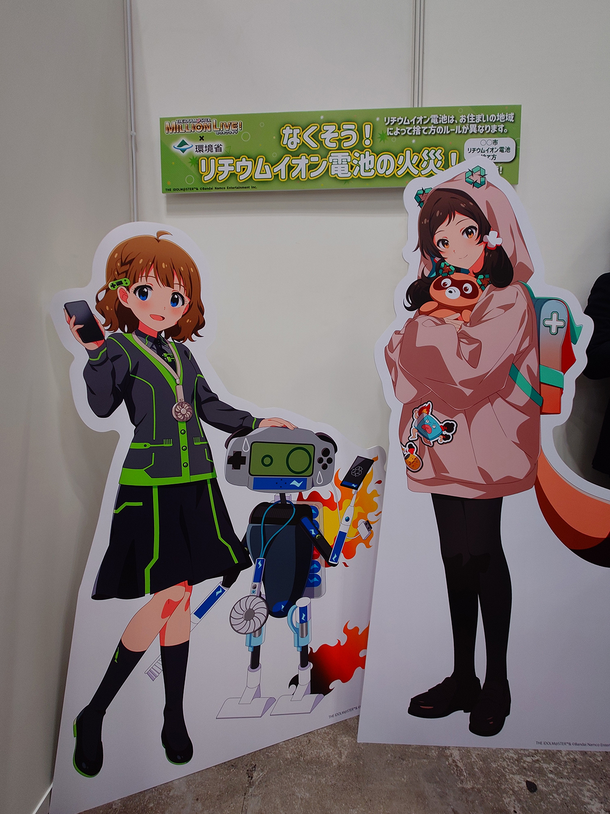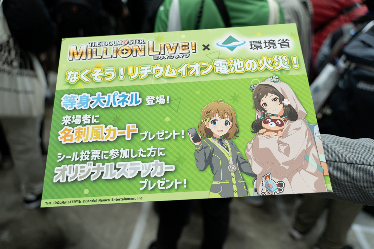 ブースは「アイドルマスター ミリオンライブ!」とコラボ。周防桃子と北沢志保による啓蒙動画がモニターに表示されていました。この動画は環境省公式YouTubeにあります。アイドルの年末ドサ周り営業感。