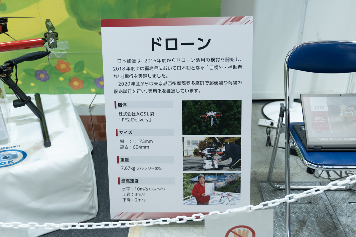 ブーススタッフによると、現在、実証実験で稼働させているドローンは全3機。展示しているのは1世代前のモデルで、2機が稼働中。残る1機が最新型で、もっと大きいそうです。