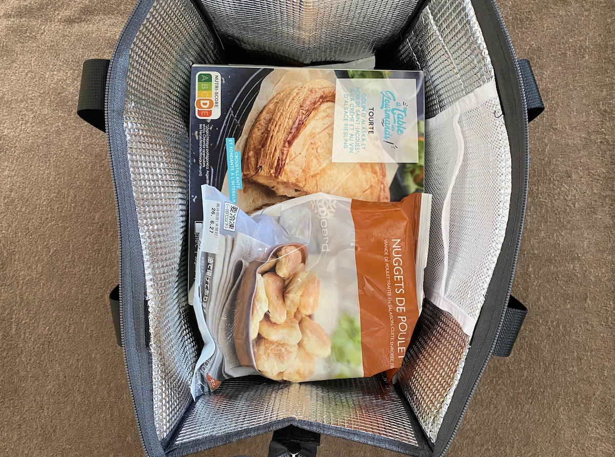 サイズは「高さ約36cm ×横幅 約36cm、マチ約20cm、ハンドル約60㎝」なのだが、しっかりした作りでマチが広いのでなんと自立もできるようになった。それでいながら、数も入るから「新」保冷バッグと名付けられているのもよく分かる。