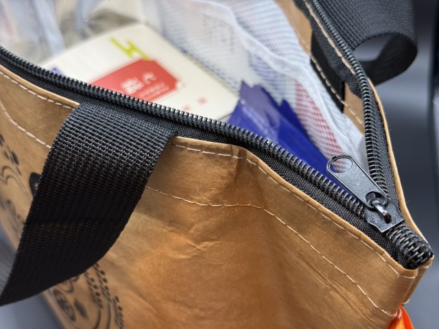 洋画で見る食料品店のショッピングバッグみたいな外観。クラフト紙に見えるけれども、しっかり保冷素材になっている。ジッパーでしっかり口を閉じられるタイプだ。さて、なにが入っているのかな……