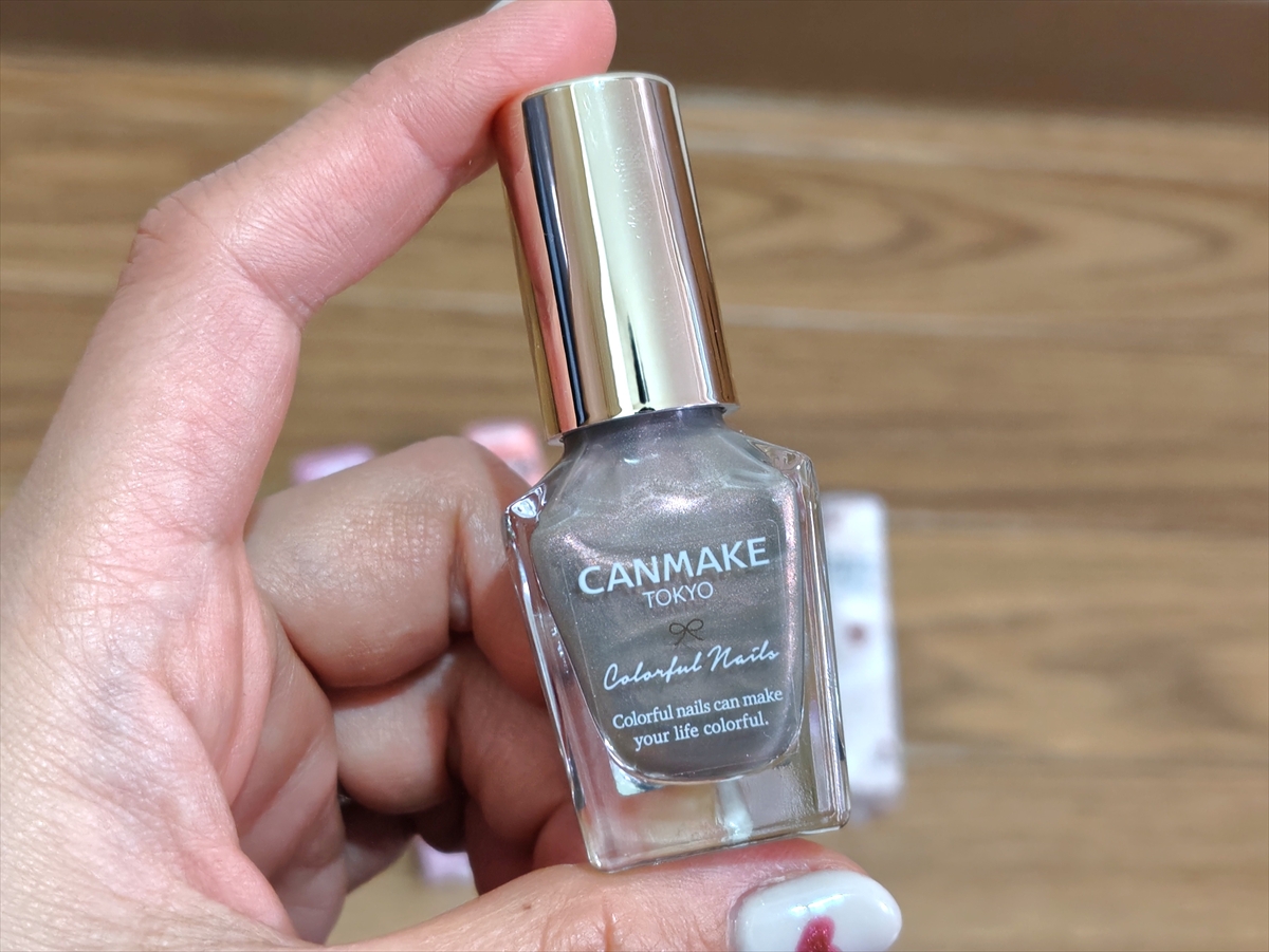 偏光パールが効いたグレージュ系のマニキュアで、虹色の細かいラメが角度によってさりげなく光る。