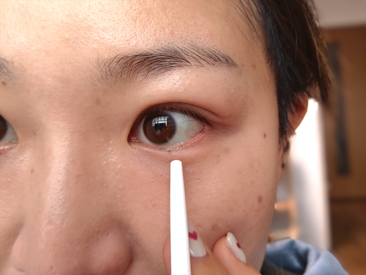 ▼反対の下まぶたにはアイバックコンシーラー。芯が柔らかく、皮膚への負担なく軽い力で塗れる。涙袋がふっくらとして見えるぞ!