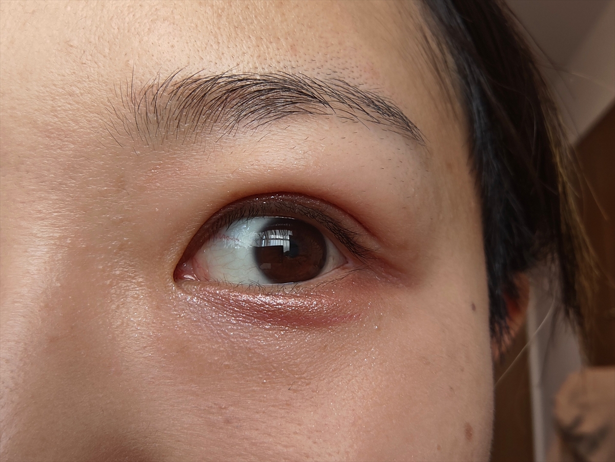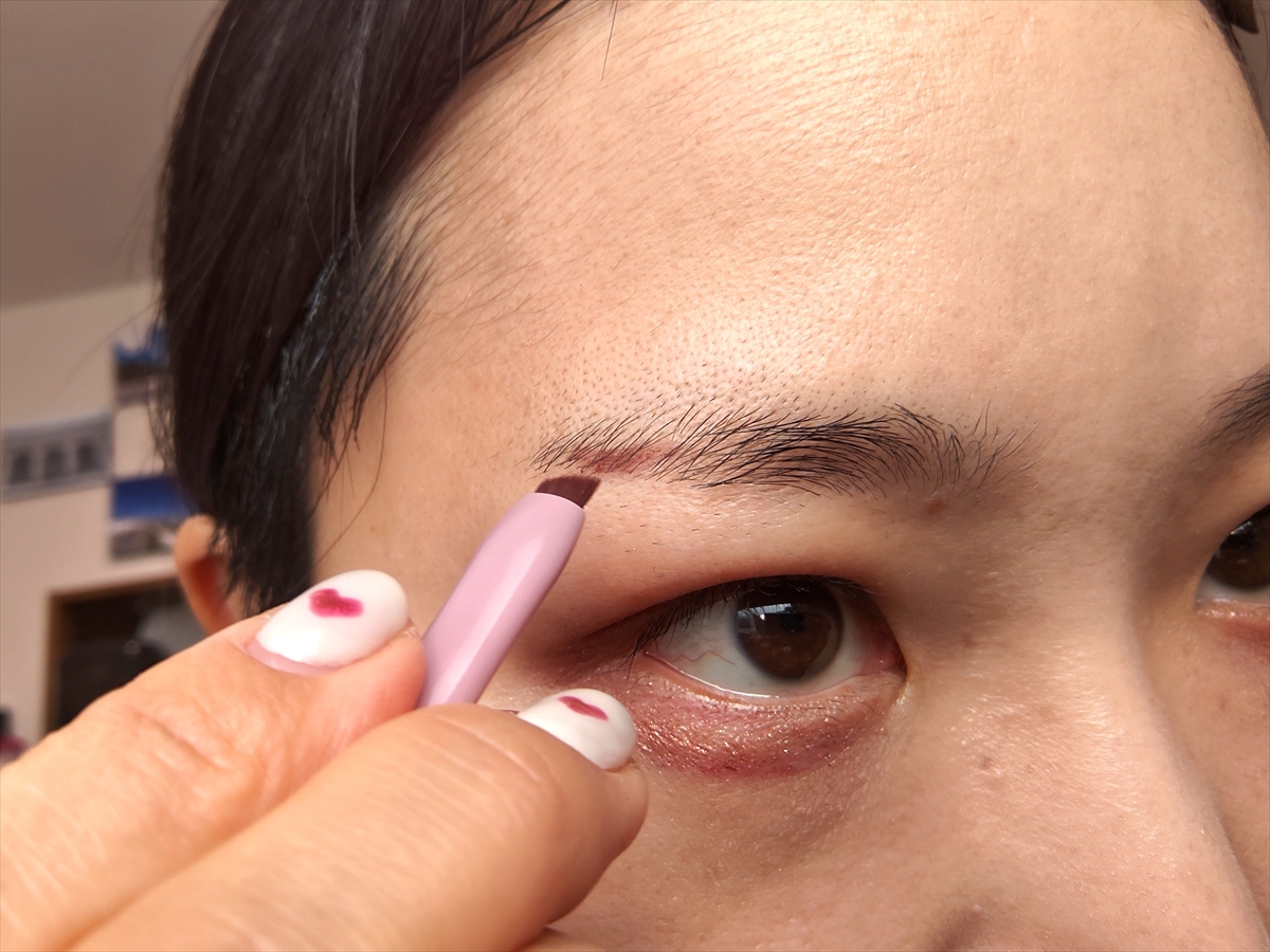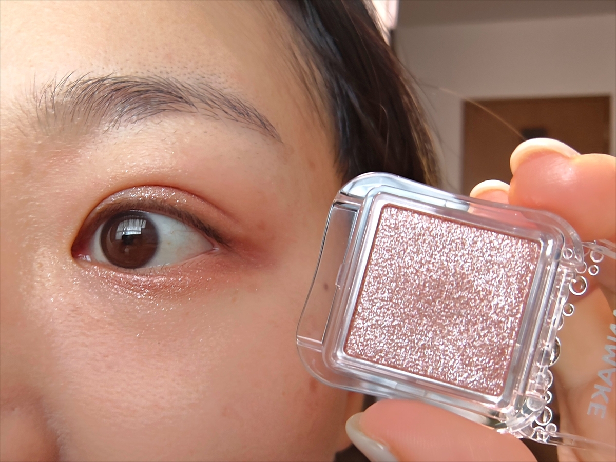 ▼本文では「このまま組み合わせてしまうと顔全体のトーンがちぐはぐになる」と書いたが、一旦は今回のコスメを組み合わせてメイクをしてみよう。まずはアイカラーマジシャン。赤みがかったラメ入りのリキッドアイシャドウ。「よれにくくたまりにくい」とのことだが、筆者が使った限りでは結構よれやすくたまりやすいかも……?