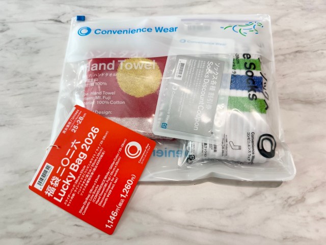 2025年は2000円で、2026年は1260円。派手なサプライズがある価格帯ではないが、コンビニエンスウェアらしい “普段使いできるアイテム” が入っているのが人気の理由だ。迷わず買ってみたので、さっそく中身を報告したい!