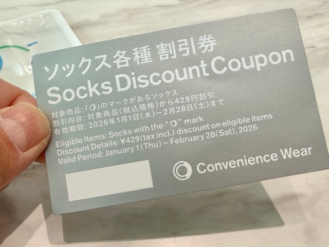 最後に入っていたのが、ソックス各種に使える429円分の割引券。ファミマのオーソドックスな靴下は429円で購入できるので、割引券を使えば「自分好みの靴下がもう1足手に入る」というとても良心的な仕組み。素直に嬉しいぞ。