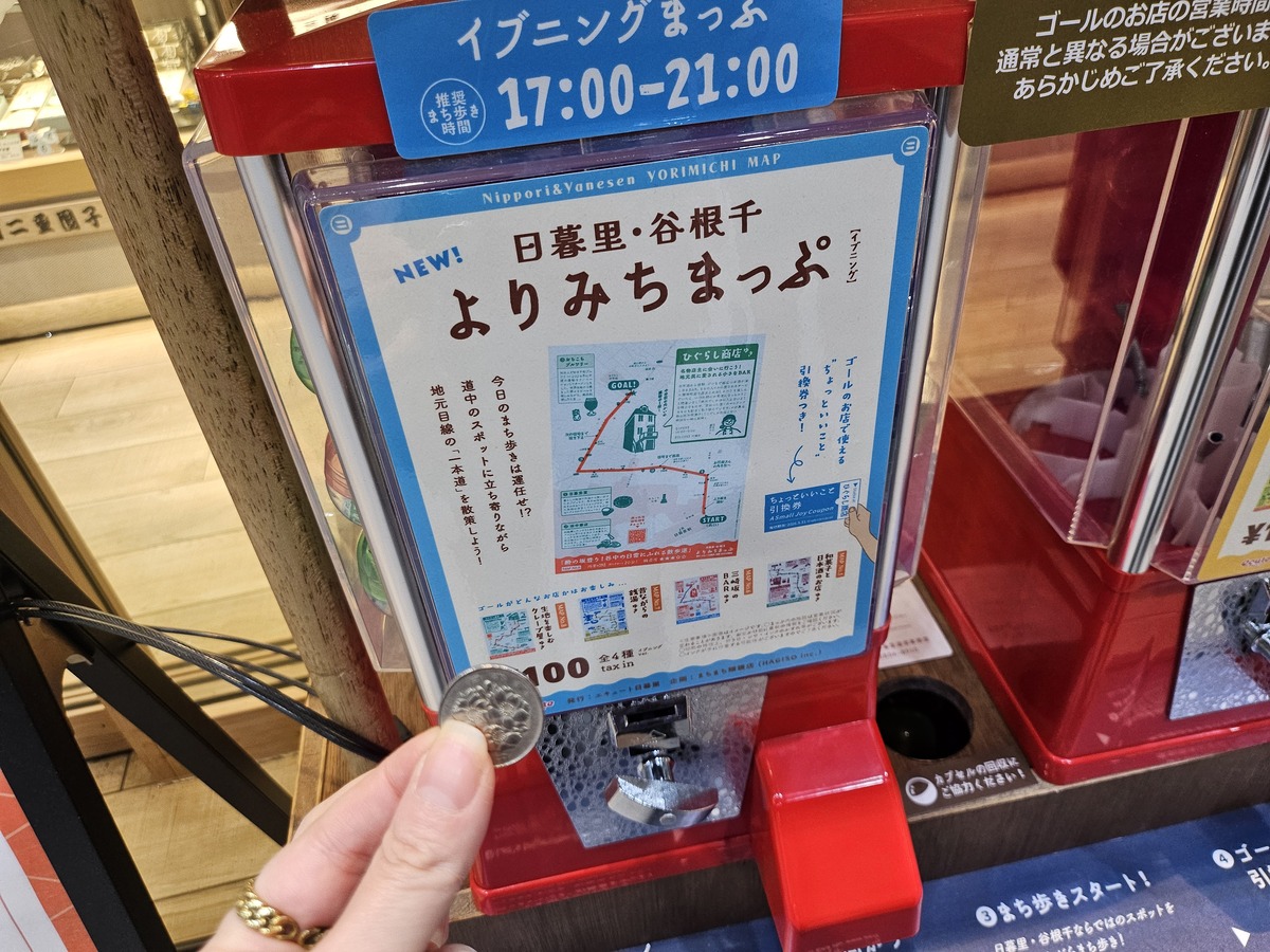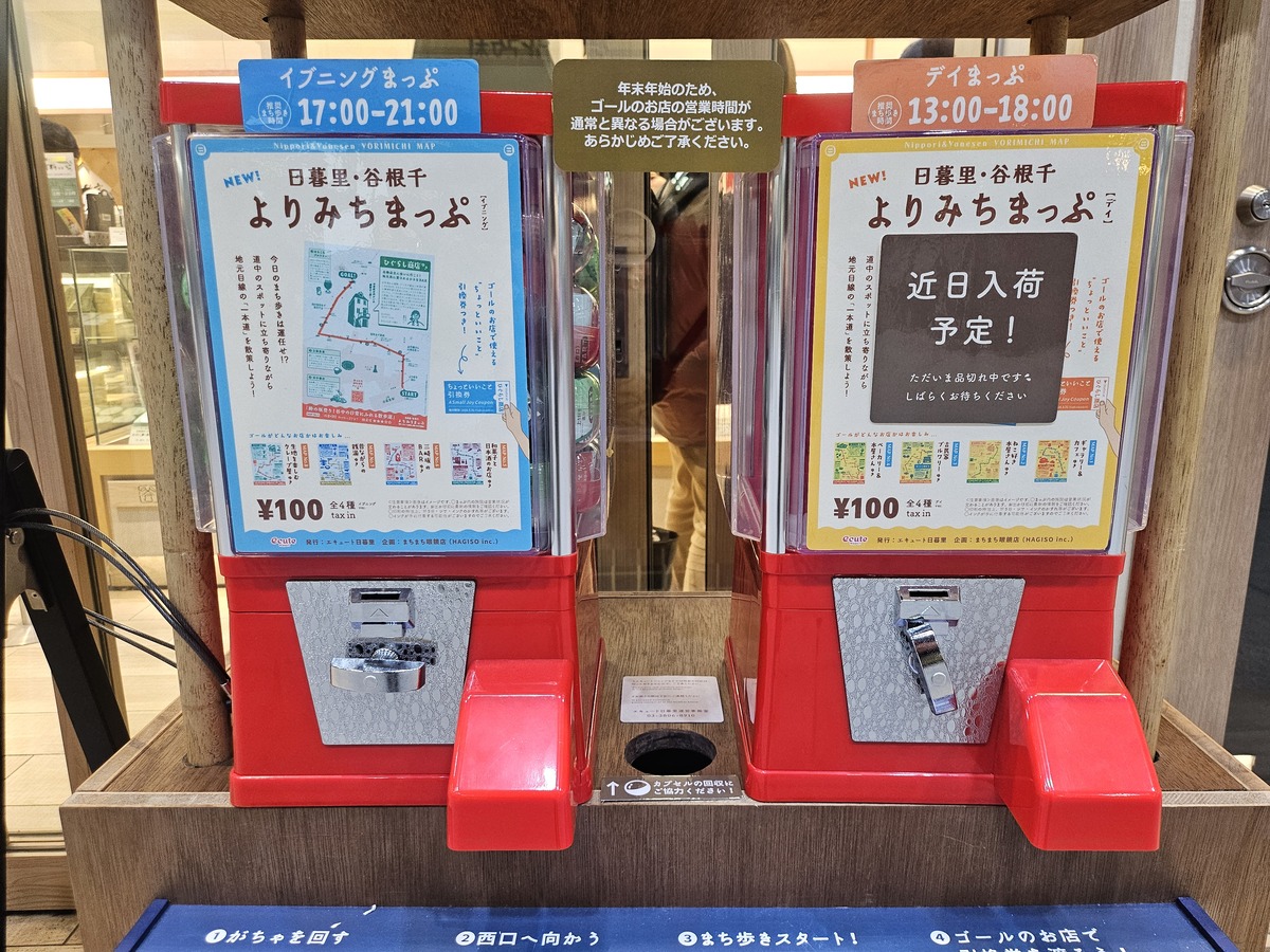 日暮里駅構内に、「よりみちまっぷ」と呼ばれる少し特殊なガチャが設置されている。中に入っているのはおもちゃではなく、街歩き用のマップだ。