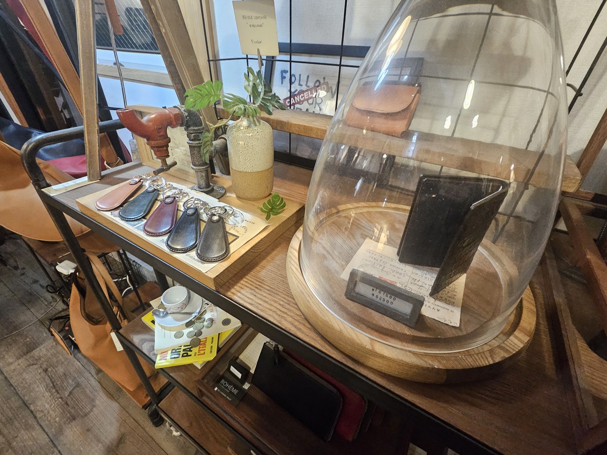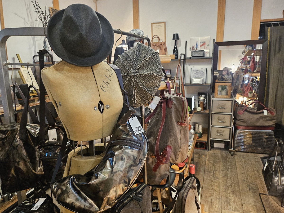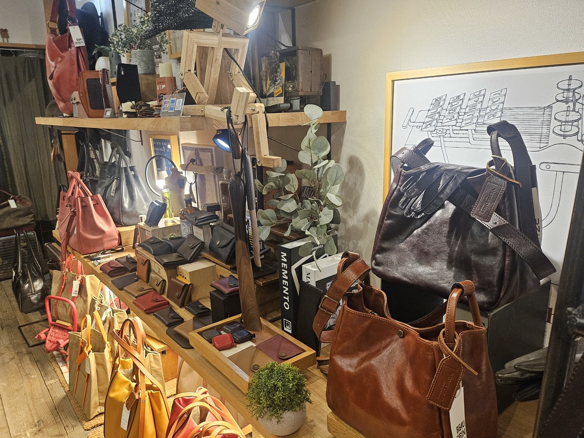 こちらは革製品を中心としたバッグや小物が並ぶデザインショップで、店主の生嶋さんがお一人で営まれている。