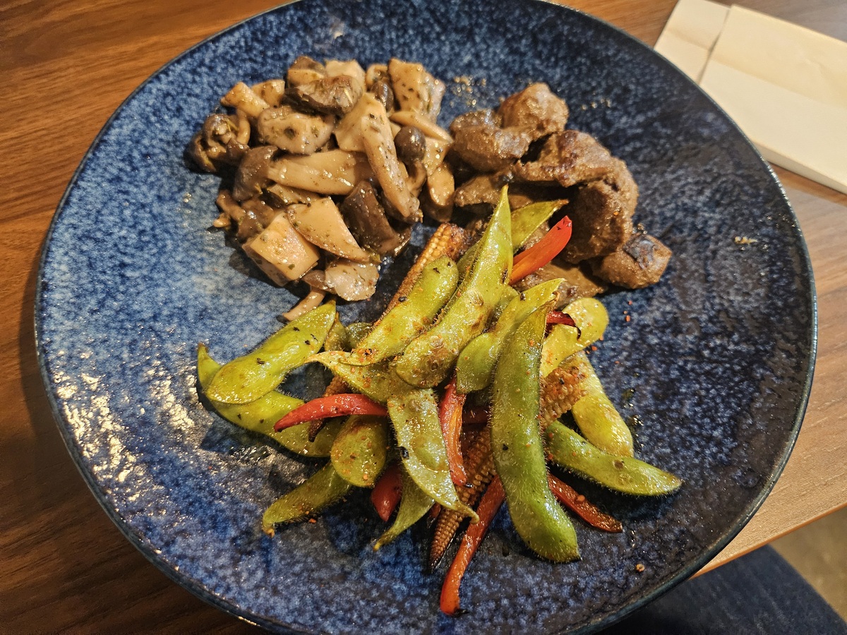 おつまみには「3点盛り(1600円)」で「4種のキノコのハーブマリネ」「砂ぎものコンフィ」「枝豆とヤングコーンの香ばし醤油」を選択した。