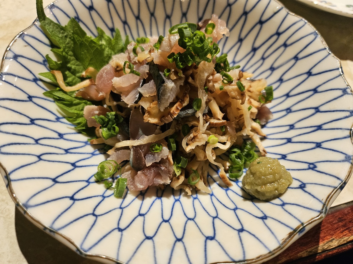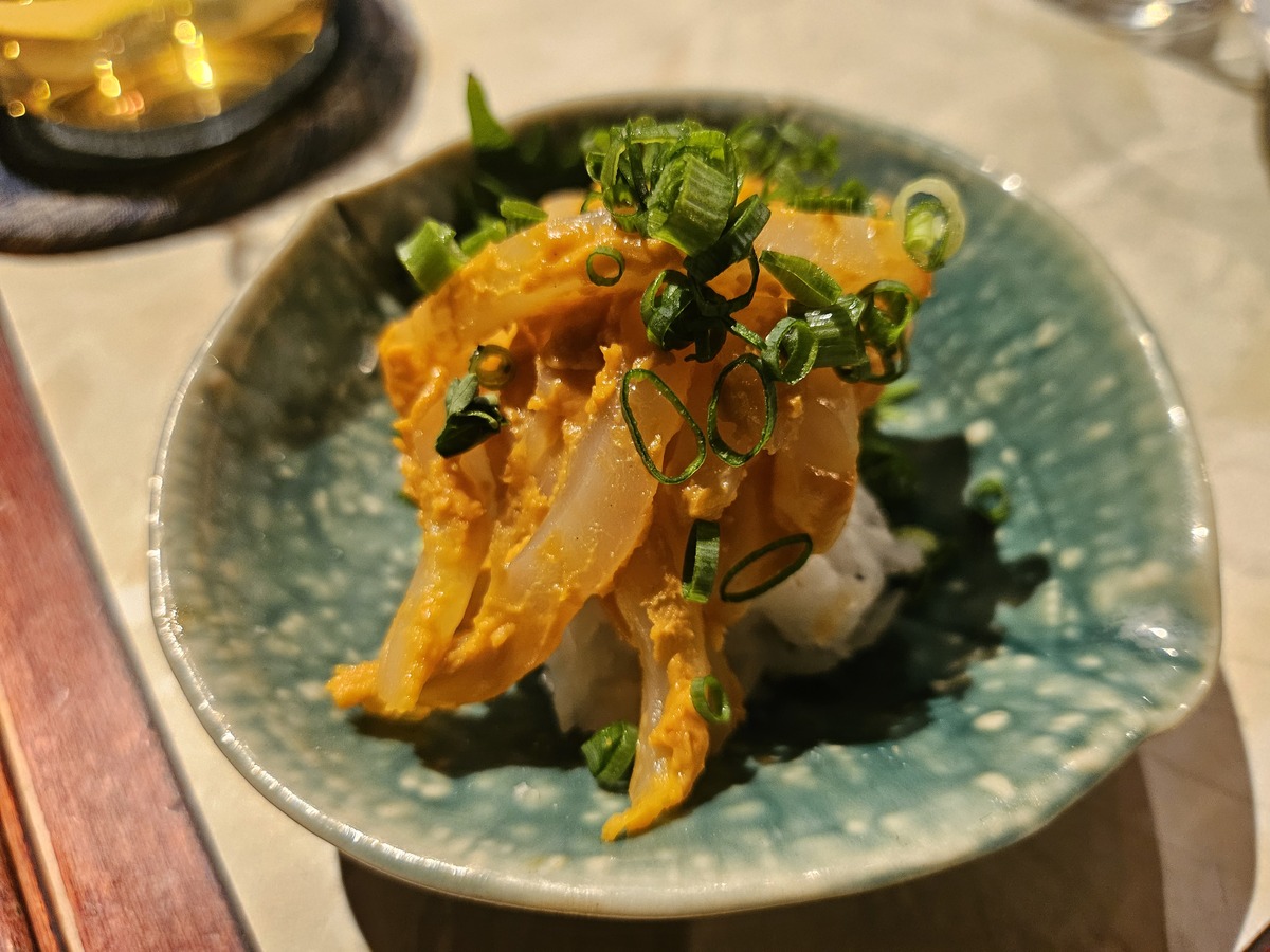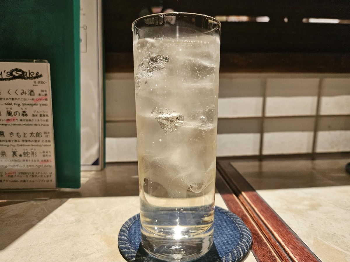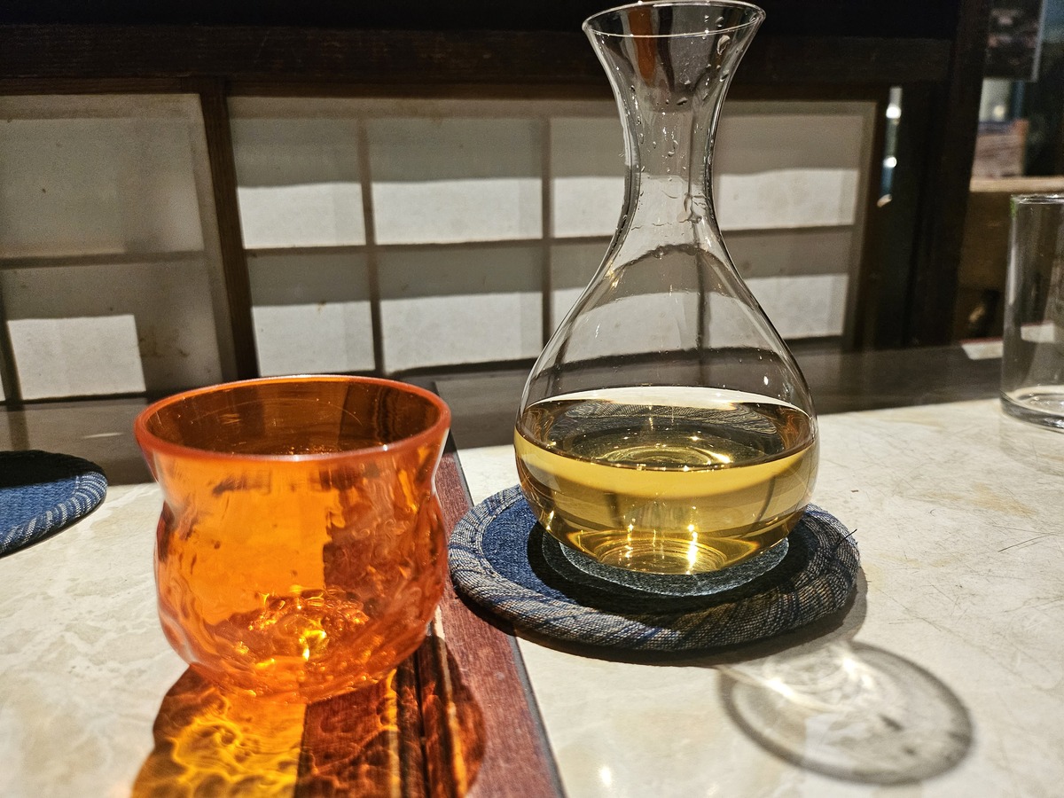 室町時代から「変わらない味」を守り続けてきた辛口で旨味の強い日本酒で、琥珀色を帯びた見た目も印象的。サービスでいただいたイカのおつまみとの相性も抜群で、最後まで満足度の高い一杯だった。