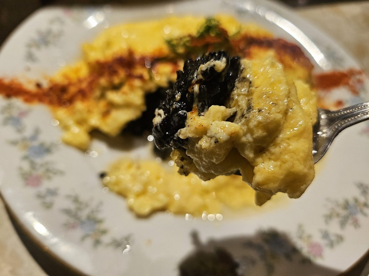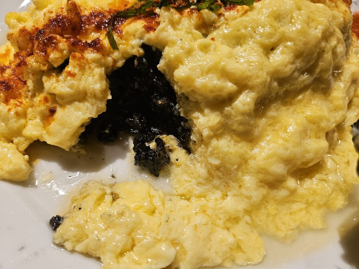 卵をめくると現れる真っ黒なお米の正体は、イカスミのシーフードリゾット。