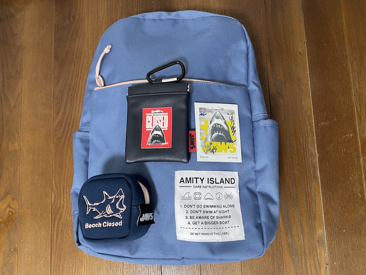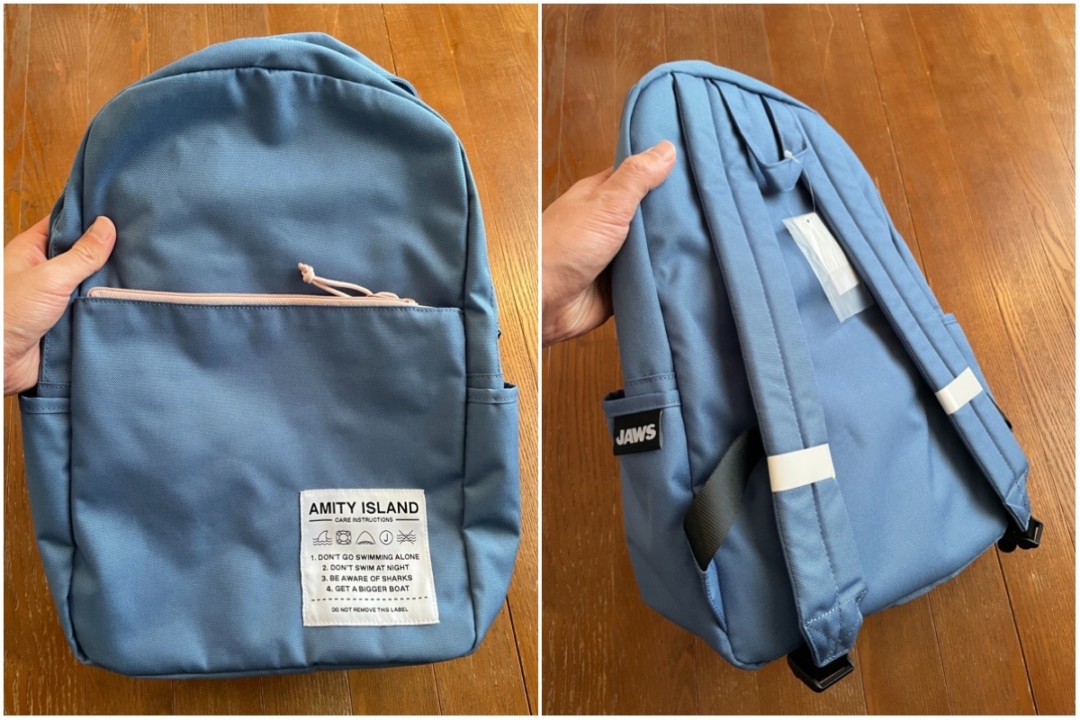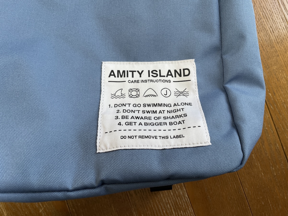 ちなみに、前ポケットに小さく書かれている「AMITY ISLAND(アミティ・アイランド)」という文字は、映画の舞台となった架空の島を指しているのだそうだ。