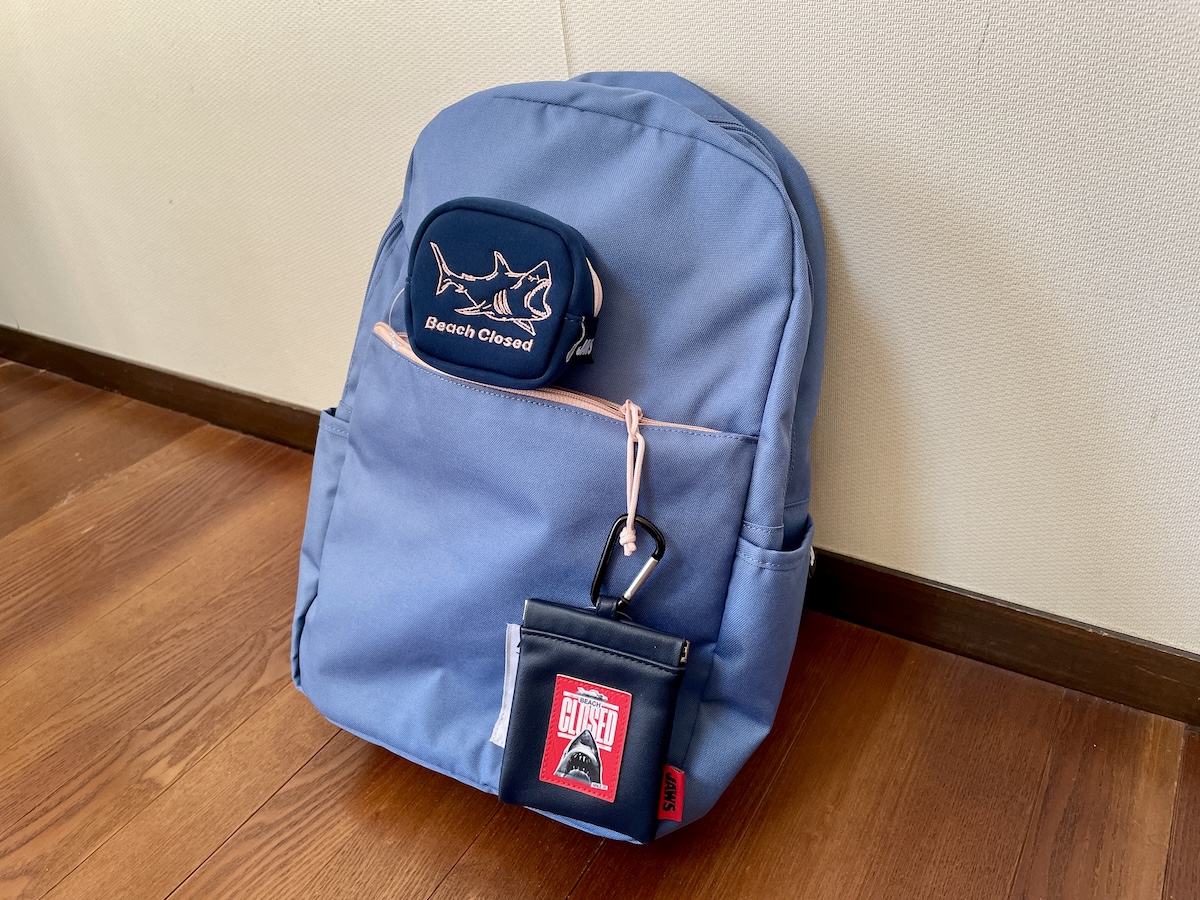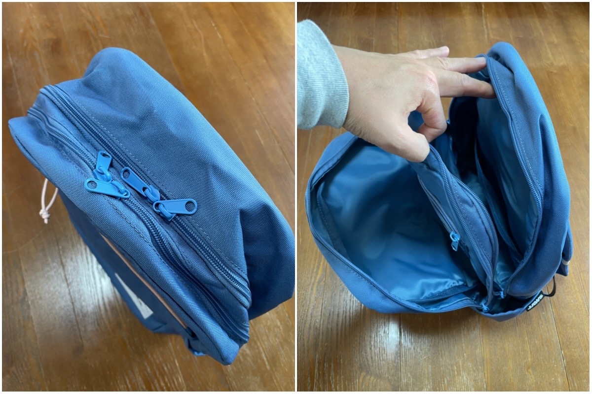 まずは、ひときわ目立つ水色のリュックから。穏やかな海を思わせる優しい色合いがとてもキュート。ジップ部分の差し色(ピンク)もかわいい。