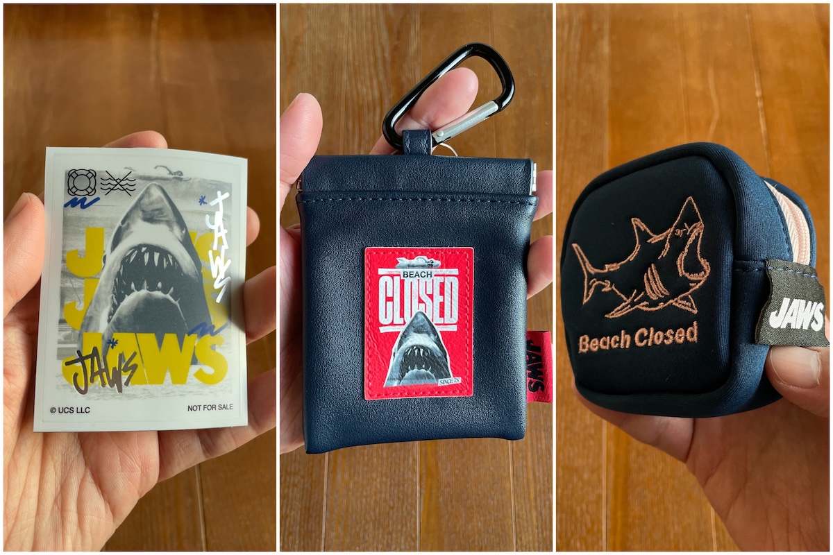 お次はこれぞジョーズ! といったデザインのステッカー & ポーチ(2点)。