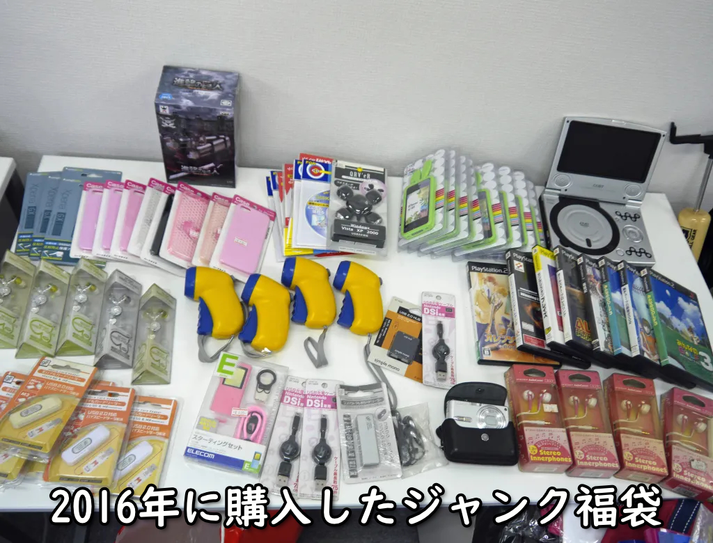思い起こせば、2016年に3000円で買った重量5.1キロの福袋はすごかった。iPhoneケースが16個、プレステ2のソフトが8本、それに使えないコンデジにDVDプレイヤーなどなど。それは凄まじい量のゴミが入ってたんだよなあ。
