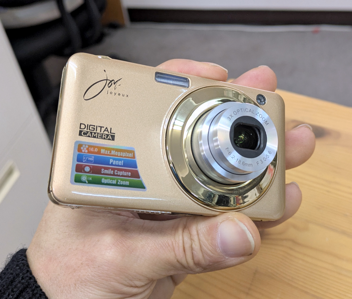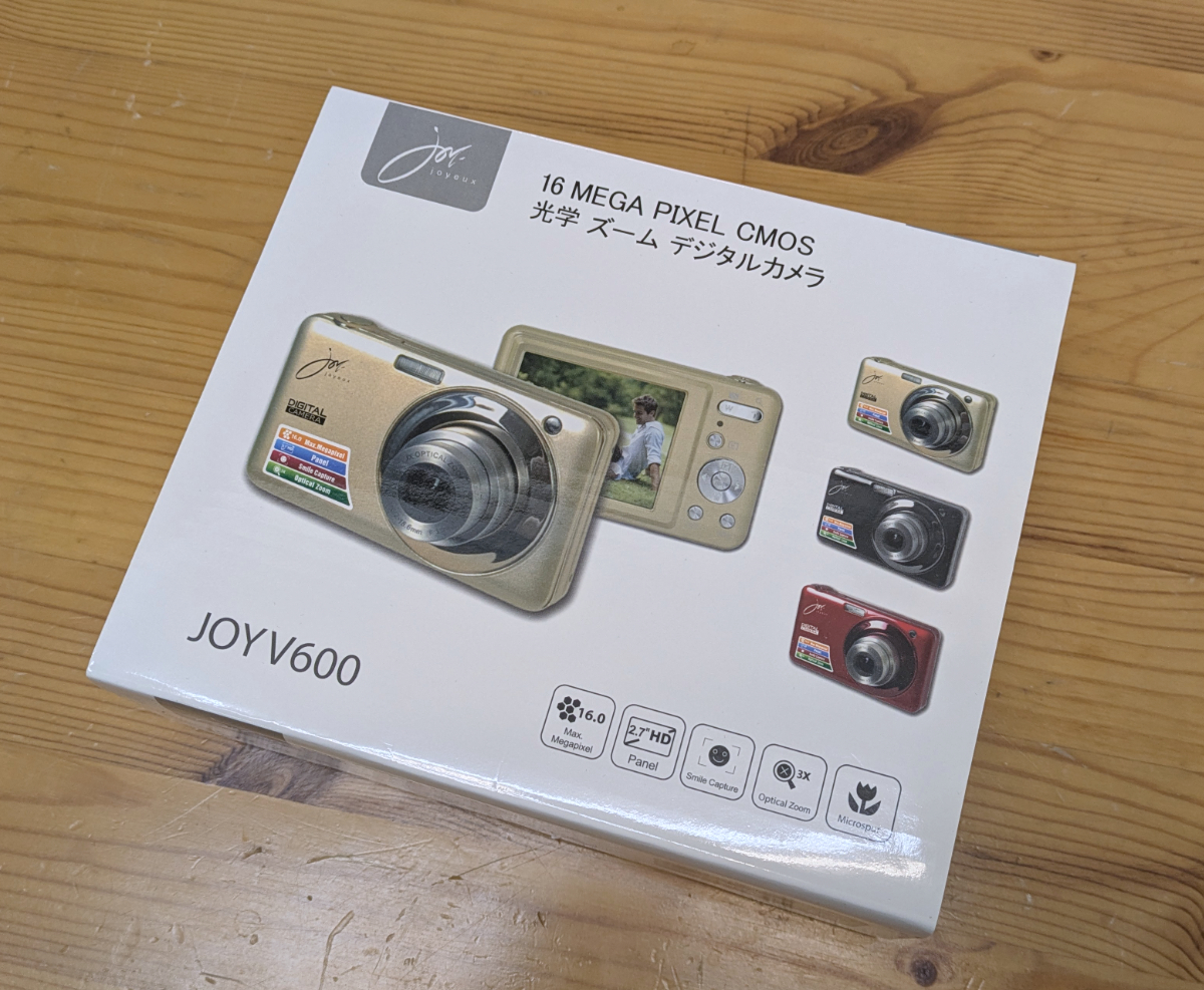 まずはコンデジから見ていこう。この製品は「株式会社ジョワイユ」というメーカーの「JOYV600」だ。2017年に発売され、現在はすでに生産が終了している。