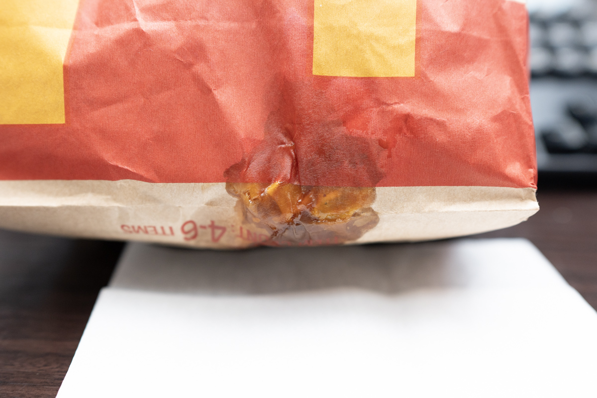 美味しいてりやきソースを味わってもらいたいという強い想いからか、底のバンズがビッタビタになるくらいてりやきソースの量が気前よく、てりやきソース浸しバーガーみたいになってるパターン。