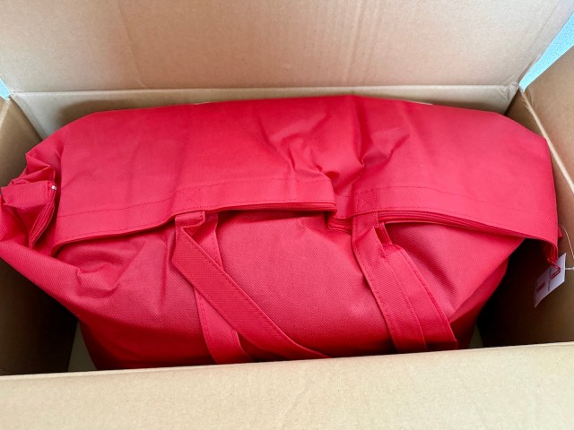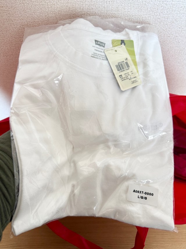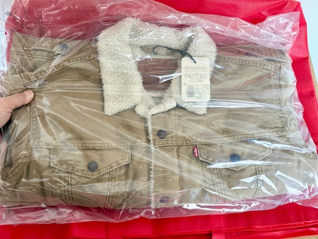 ダンボールにはリーバイスの赤い袋が入っていた。さっそく中身を取り出してみよう。中に入っていたのは以下の4点だっ!