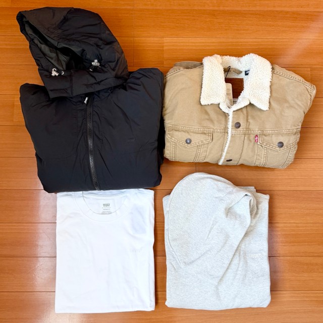 リーバイスの福袋は抽選制ではなく早い者勝ち。入手難易度は非常に高く、今回も販売スタート直後になんとかゲットした次第だ。くり返しになるが、福袋Dタイプはトップス2点・アウター2点という構成である。