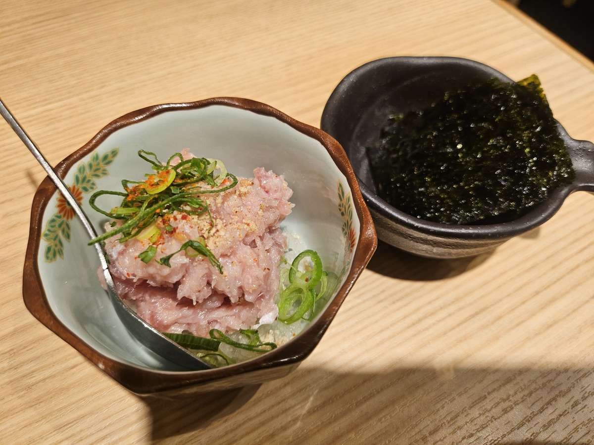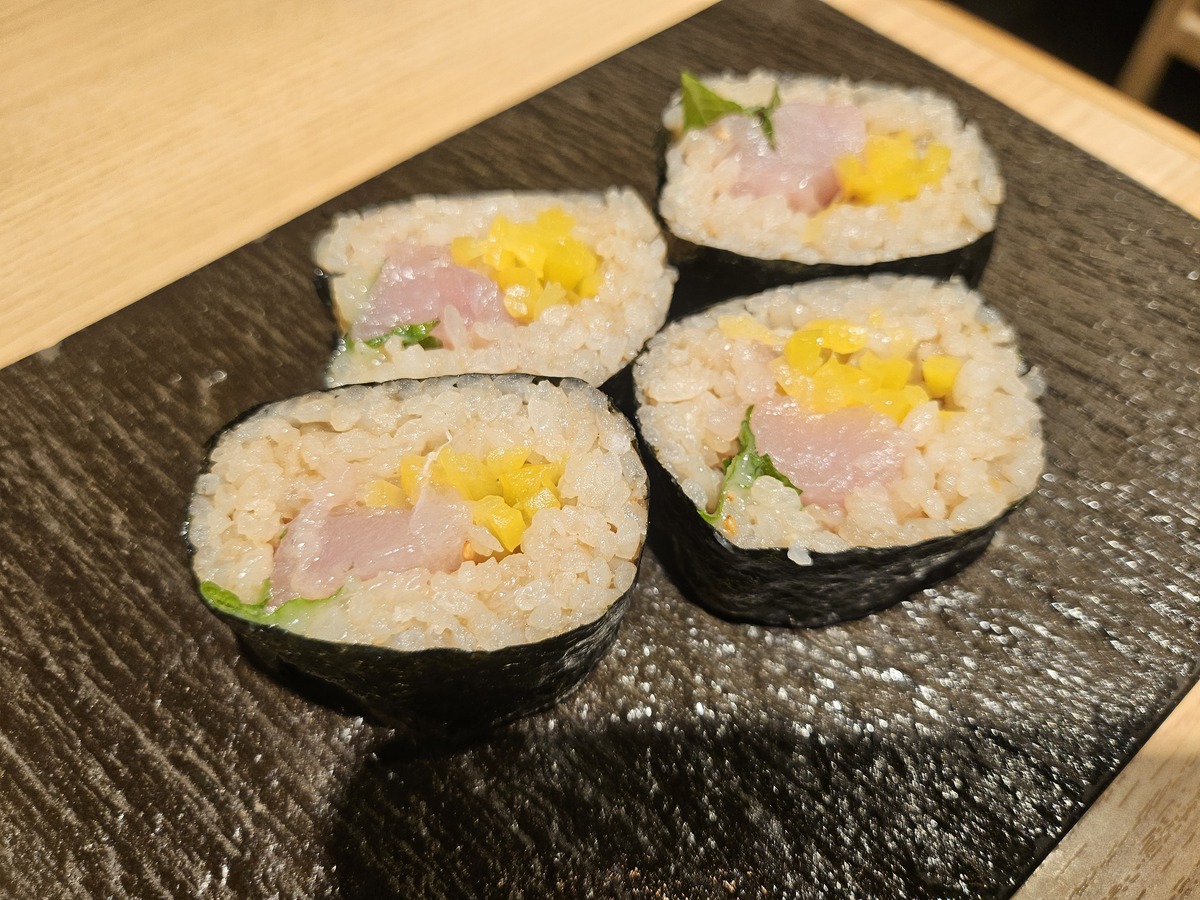 「びんちょう鮪巻き」はたくあんのポリポリ食感と大葉の爽やかさが良いアクセント。シンプルながら満足度の高い一品だった。