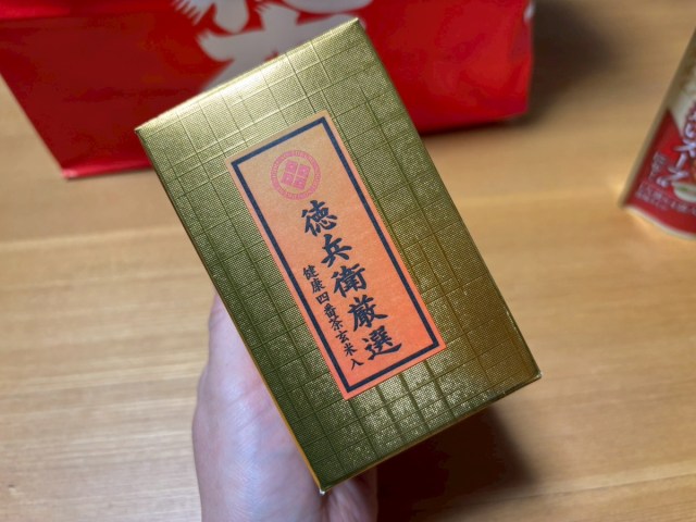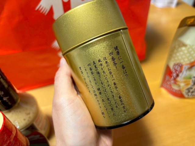 ▼健康四番茶玄米入りのお茶缶は金ピカの箱に入っていた