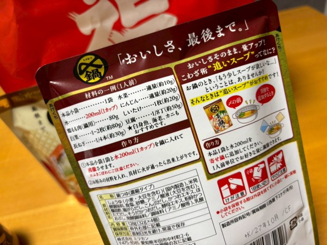 パッケージを見ると、追いスープにも良い分量だそうだ。確かに家族で鍋をしていて、つゆを足したいときあるもんな。