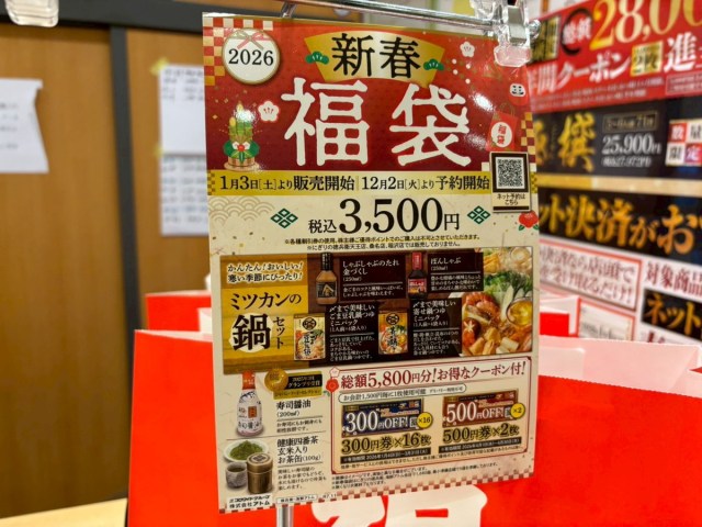 ちなみにミツカン商品はメーカー参考価格で合計約1700円、醤油が560円で、お茶缶が意外に高価で1060円だった。商品分は総額3320円。3500円の福袋代金の元を取ろうとするためには、クーポンを使うしかない。