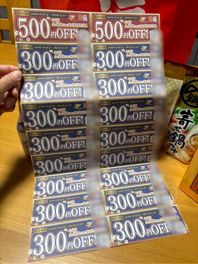 ちょっと計算してみると、300円券を使うには最低でも1500円の飲食が必要で、実質的な割引率は20%。500円券の割引率は約33%。さらに店内飲食か店頭払いのテイクアウトのみ有効で、デリバリーは不可。他のクーポンやサービスとの併用もできない(株主優待を除く)。