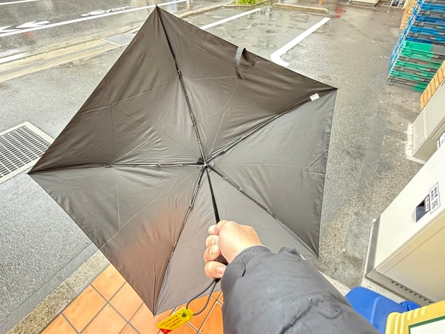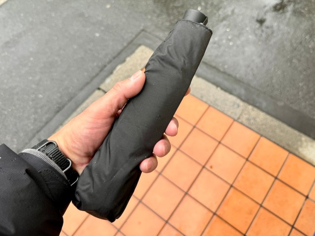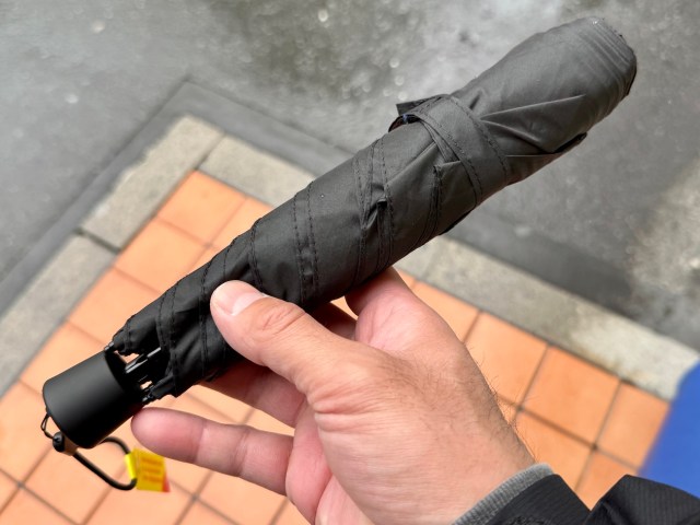 【傘部門1位】Temuの「折りたたみ傘(580円)」を会社に持参したら衝撃的事実が発覚! スマホとほぼ同じサイズの超コンパクト傘だったが…