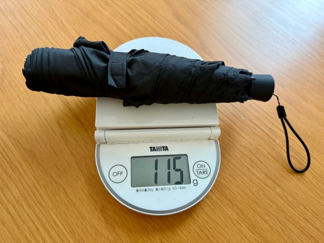 以前紹介したワークマン傘は285グラム、ニトリ傘は341グラムだった。「軽ブレラ」と名乗るだけのことはあるようだ。もはやカバンの中に常備できるレベルの重量である。