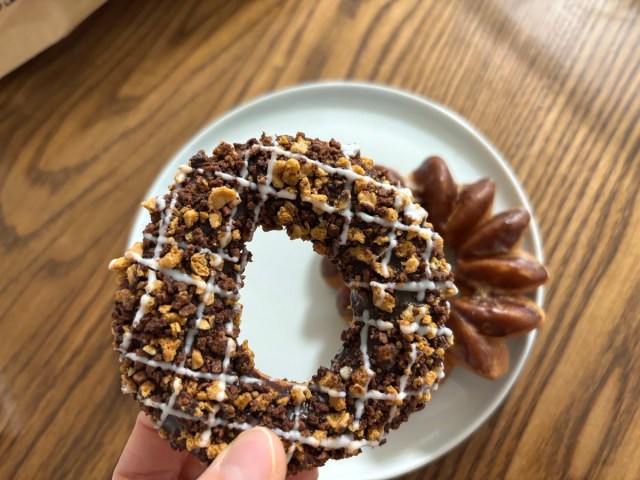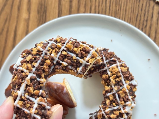 正直、どちらも275円ギリギリを狙いたかったが、プレミアリッチショコラがおいしそうで……。そんなプレミアリッチショコラは、モチモチ生地に濃厚なチョコレートをまとわせ、アーモンドチョコレートクランチがトッピングされている。
