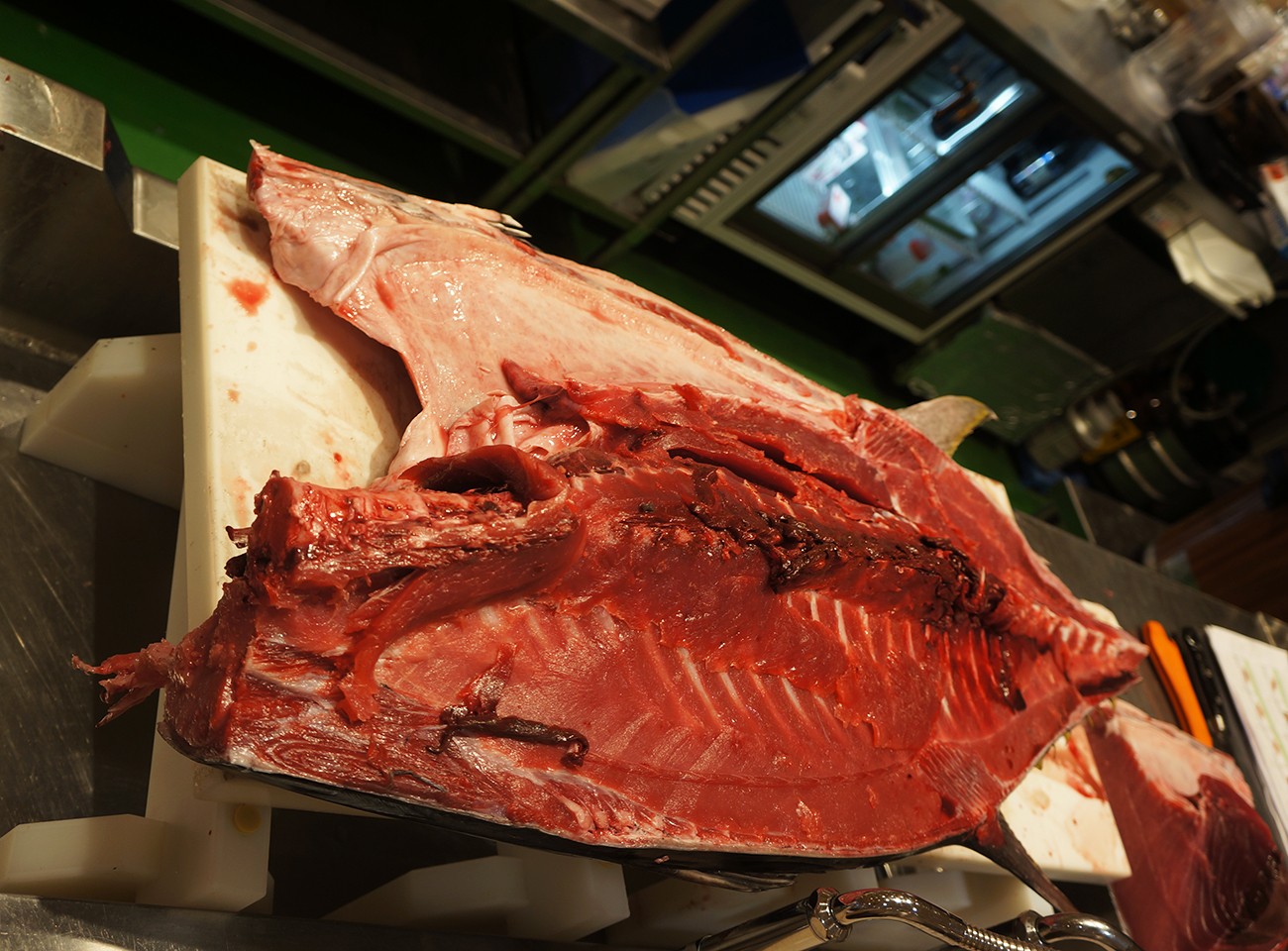 メディア向けの解体ショーで登場したのは約58kgの生本まぐろ。映像で見ただけでも子供の頃の私にとってはお化けだったけど、目の前で見ると重量感や存在感がレべチだ。マグロって凄い。ゆえにひっくり返したりするのも2人がかり。
