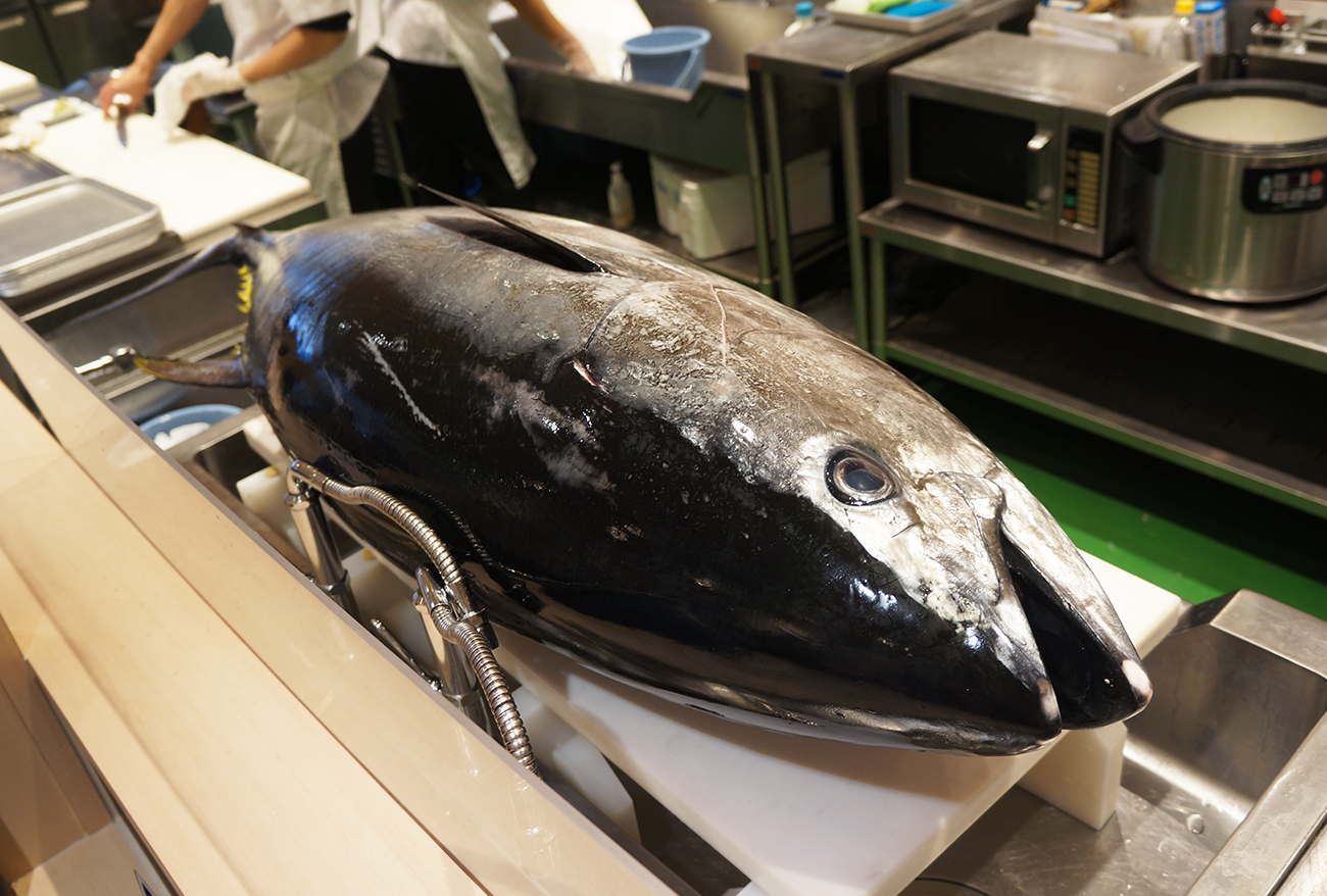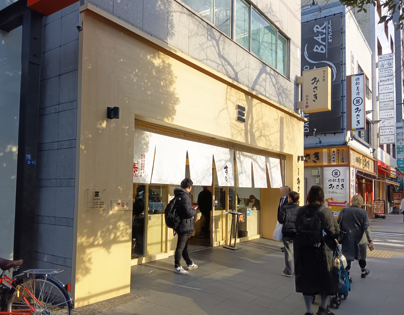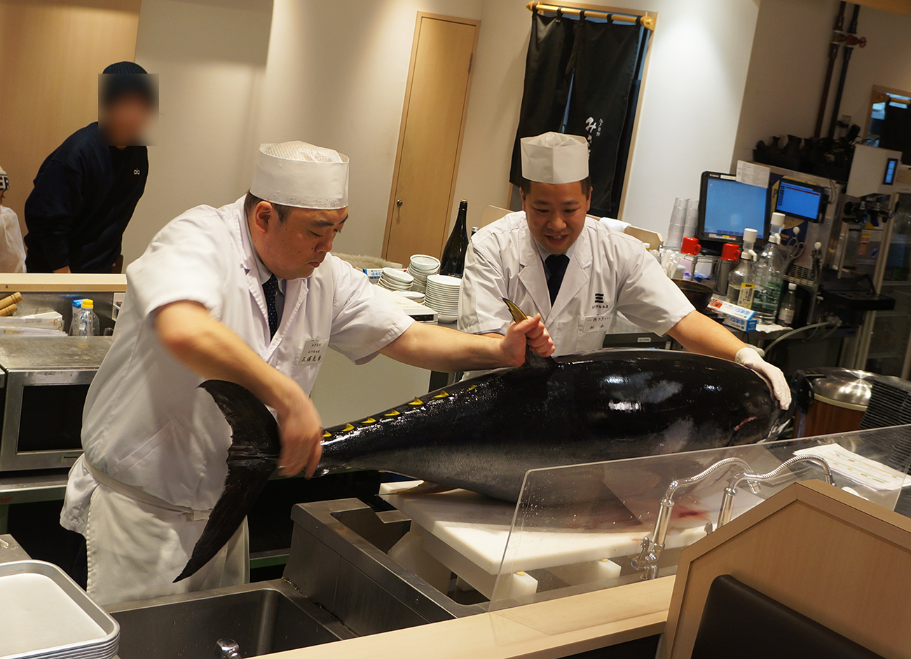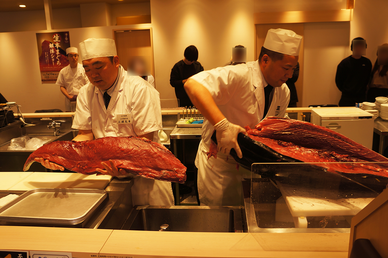 そんなわけでやって来たのは人形町にある『江戸前鮨みさき総本店』。解体ショーが開催される店の1つで、ここは回転寿司ではないタイプの店だけど、1月10日の他の開催店舗は『回転寿司みさき三軒茶屋東急ストア店』と『回転寿司みさき武蔵小金井店』なので回転寿司店舗でもちゃんと開催される様子。