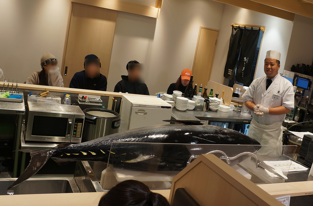 そんなわけでやって来たのは人形町にある『江戸前鮨みさき総本店』。解体ショーが開催される店の1つで、ここは回転寿司ではないタイプの店だけど、1月10日の他の開催店舗は『回転寿司みさき三軒茶屋東急ストア店』と『回転寿司みさき武蔵小金井店』なので回転寿司店舗でもちゃんと開催される様子。