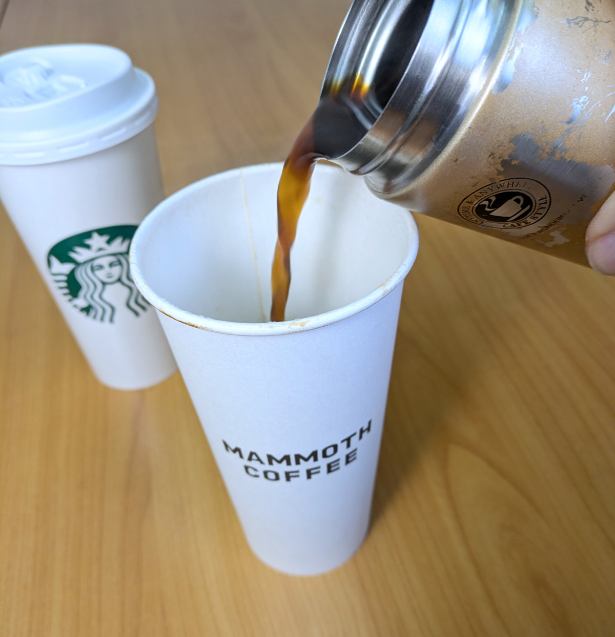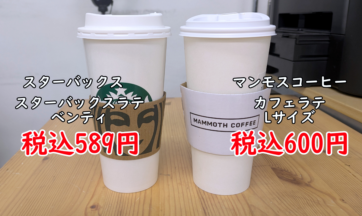 一瞬、「スタバの方が安いのか!?」と錯覚しそうになったが、内容量が違う点に気づき、「やっぱマンモスコーヒーの方が安いんじゃない?」という結論に至った。